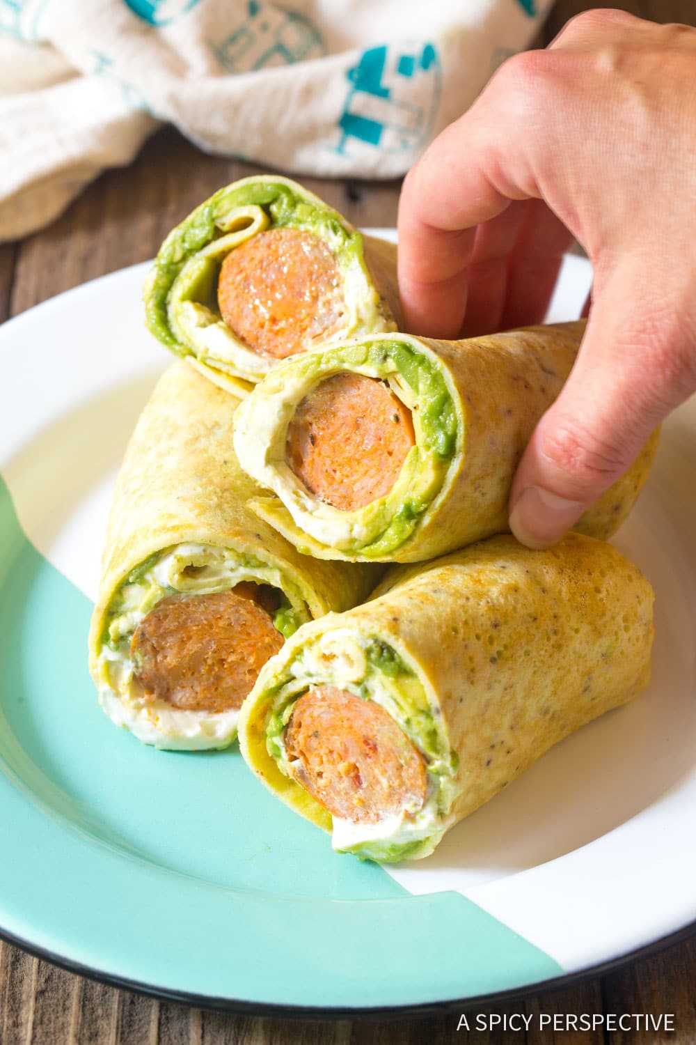 “Low Carb Keto Breakfast Egg Wrap Recipe, stuffed with chicken sausage, avocado, and jalapeno cream cheese. “. Recipe: ASpicyPerspective.