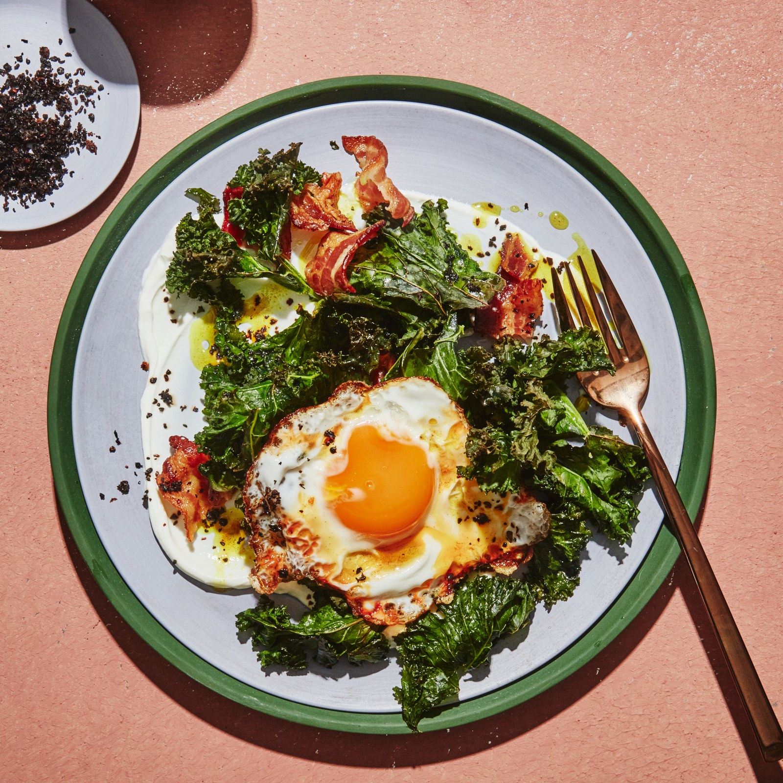 Turmeric Fried Eggs with Kale, Yogurt, And Bacon