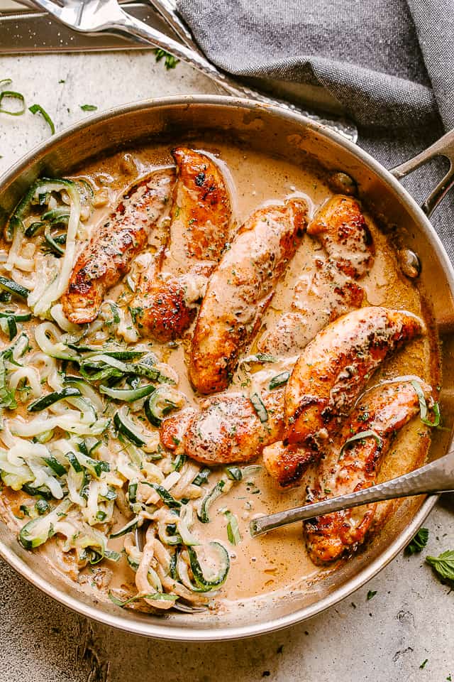 “This easy Chicken Lazone recipe is the low carb chicken dinner of your dreams! Pan-fried, juicy, and deliciously seasoned chicken tenders served with zucchini noodles tossed in the most amazing cream sauce. Ready in just 30 minutes, this restaurant worthy dinner is perfect for a quick weeknight meal!”. Recipe: DietHood.
