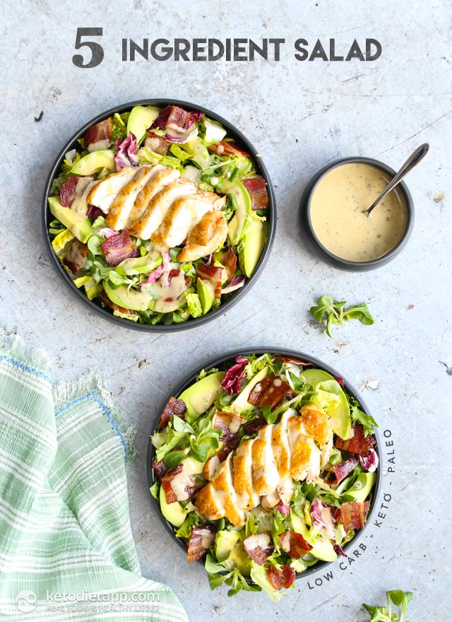 “I made my keto & paleo salad with crispy bacon and chicken breast cooked in a skillet and then finished off in the oven. If you’re short on time, simply use leftover rotisserie chicken. I also used avocado which is the key ingredient that will provide heart-healthy monounsaturated fats and electrolytes to keep keto-flu at bay.”. Recipe: KetoDietApp.