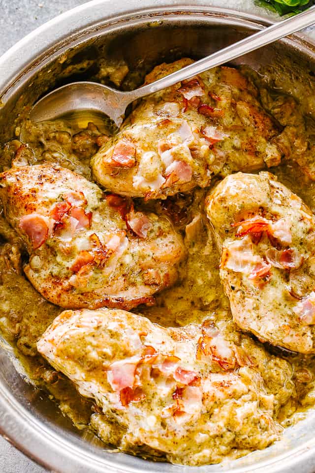 “Baked Pesto Alfredo Chicken – Alfredo style Pesto Chicken is a delicious recipe that is ready in 30 minutes, is also low carb, KETO, and gluten free! Serve over zoodles or cauliflower rice and you’ll soon realize that this is the BEST Alfredo Chicken, even without the pasta!”. Recipe: DietHood.