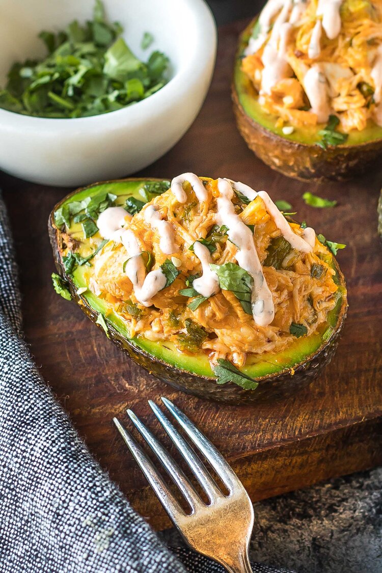 “Can you even? Cheesy. Buffalo. Chicken. Stuffed. AVOCADOS FTW. Seriously, these stuffed avos are SO good. They remind me of buffalo chicken dip and wings, it’s like those two dishes had a baby and threw some guacamole on top. I’m digging it.”. Recipe: CastIronKeto.