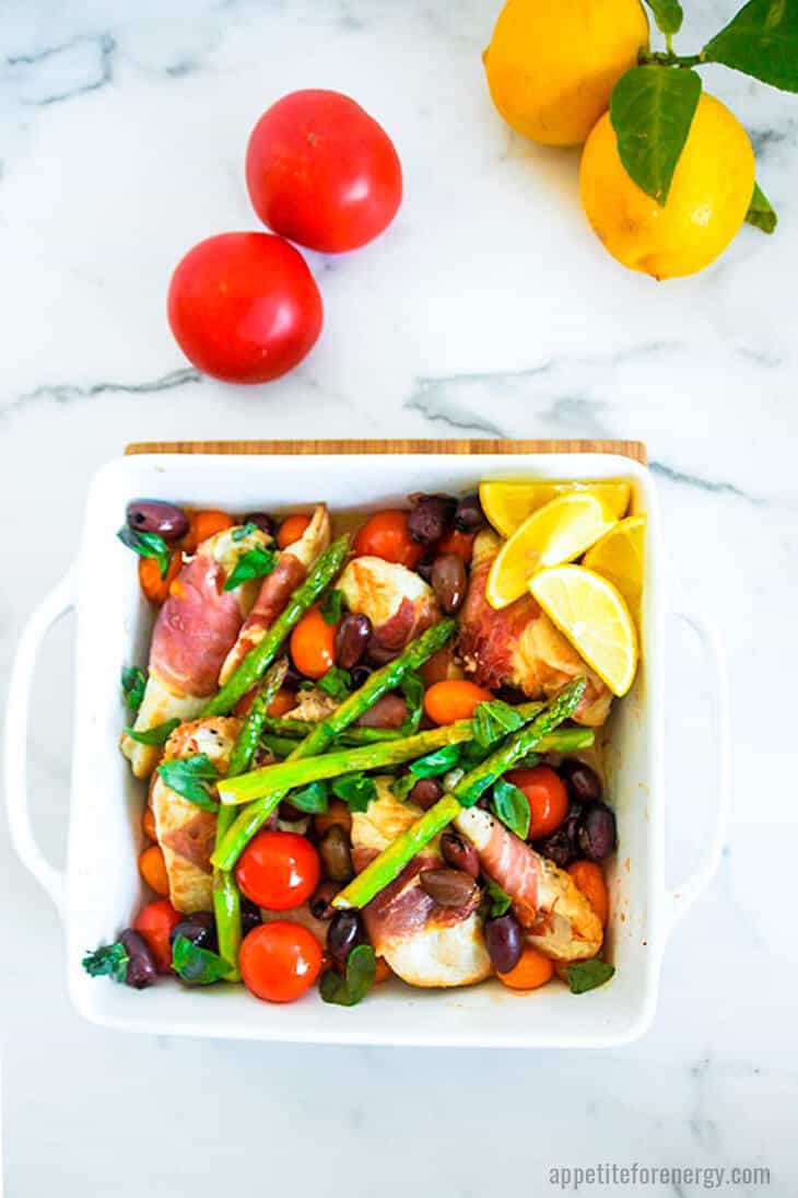 “Keto Prosciutto Wrapped Italian Chicken delivers maximum Mediterranean flavor in just ONE PAN. Nestle tomatoes, olives and asparagus around a centerpiece of prosciutto-wrapped chicken and take a trip to Italy tonight!”. Recipe: AppetiteForEnergy.
