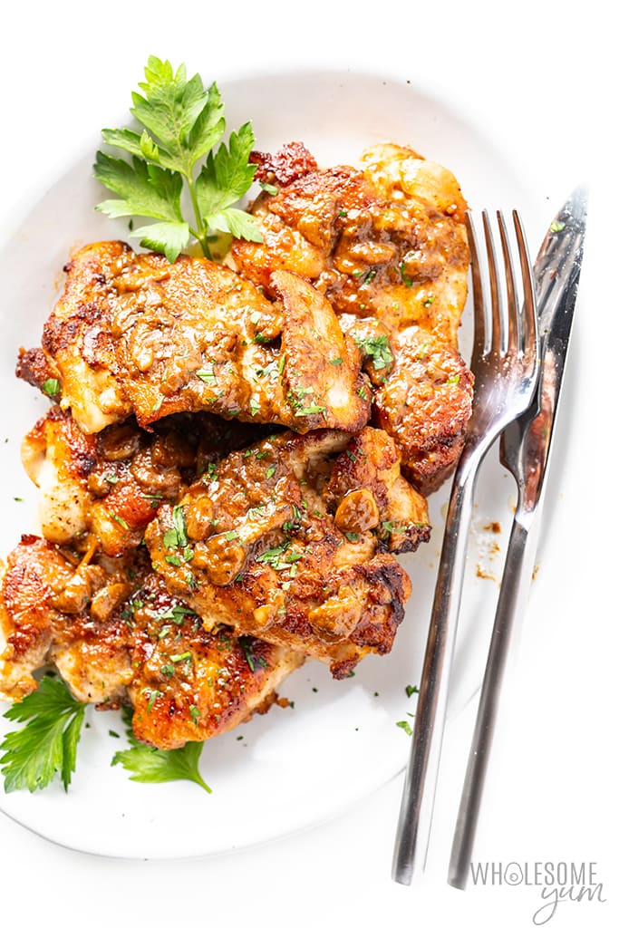 “Garlic butter chicken thighs make a perfect low carb chicken dinner! This creamy garlic chicken recipe is fancy enough for guests, but easy enough for weeknights.”. Recipe: WholesomeYum.