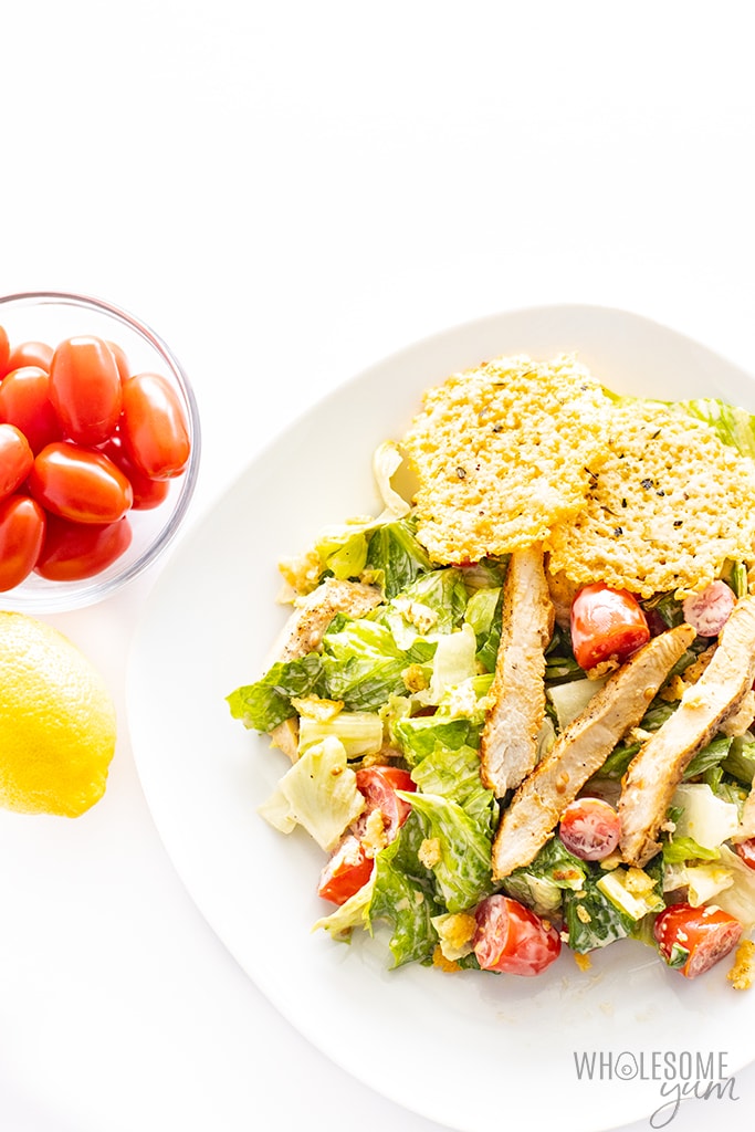 “Caesar salad on keto is simple to make, with common ingredients! This easy keto Caesar salad recipe with chicken features parm crisps and homemade keto Caesar dressing.”. Recipe: WholesomeYum.