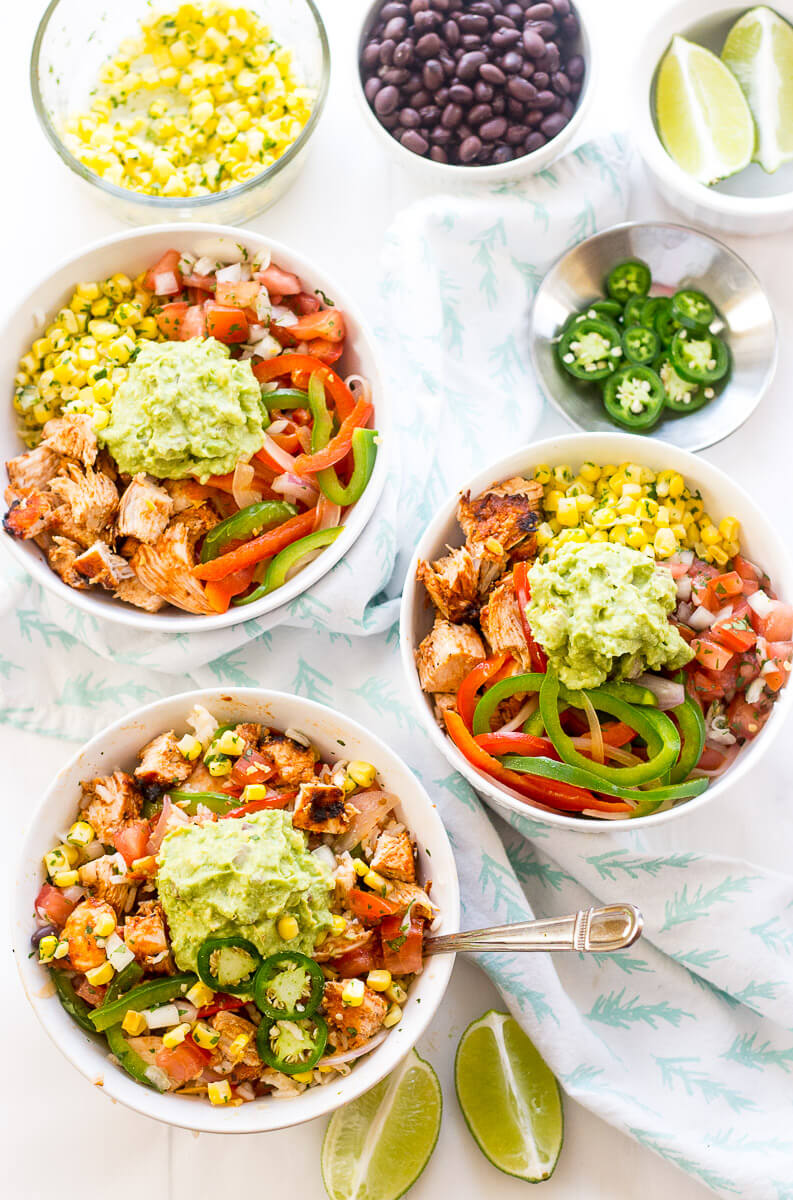 “These BBQ Chipotle Chicken Burrito Bowls are filled with corn salsa, pico de gallo, guacamole, chipotle marinated chicken and stir fried veggies. They are the most delicious Mexican-inspired dinner!” Recipe: TheGirlOnBloor.