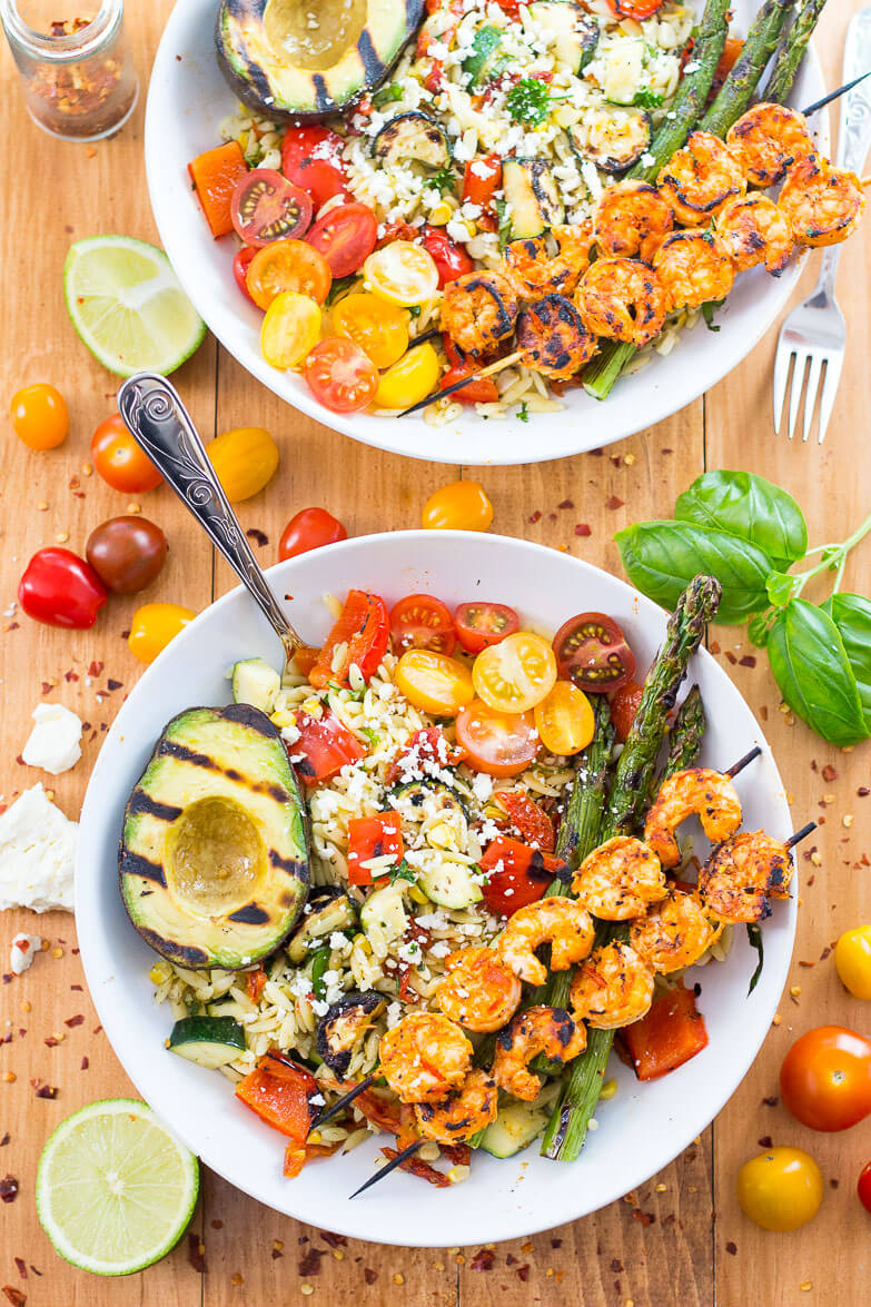 “These Grilled Harissa Shrimp & Orzo Bowls are served with a variety of grilled summer vegetables tossed in a light, lemony and herb-filled serving of orzo.” Recipe: TheGirlOnBloor.