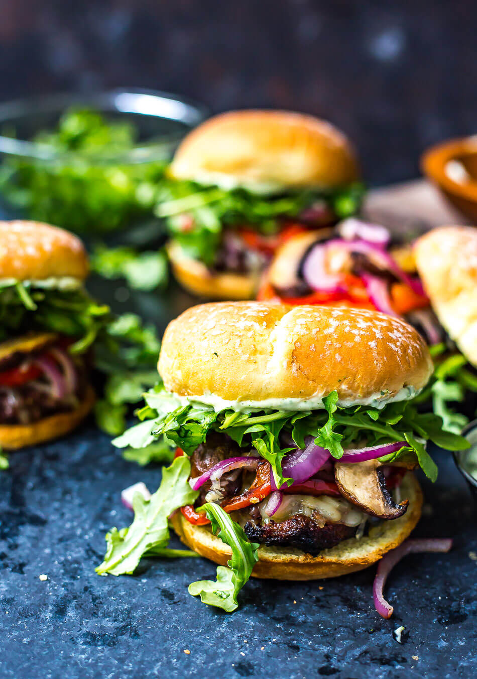 “These Mediterranean Portobello Beef Burgers are a healthy BBQ recipe – topped with garlic and herb cheese, roasted red peppers, arugula and basil mayo, you’ll be craving these all week!” Recipe: TheGirlOnBloor.