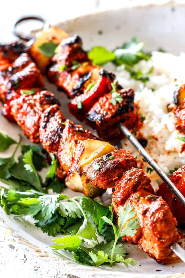 “Al Pastor Kabobs are your favourite pineapple, chile marinated pork with beautifully charred edges and caramelised pineapple in easy kabob form”. Recipe: CarlsBadCravings.