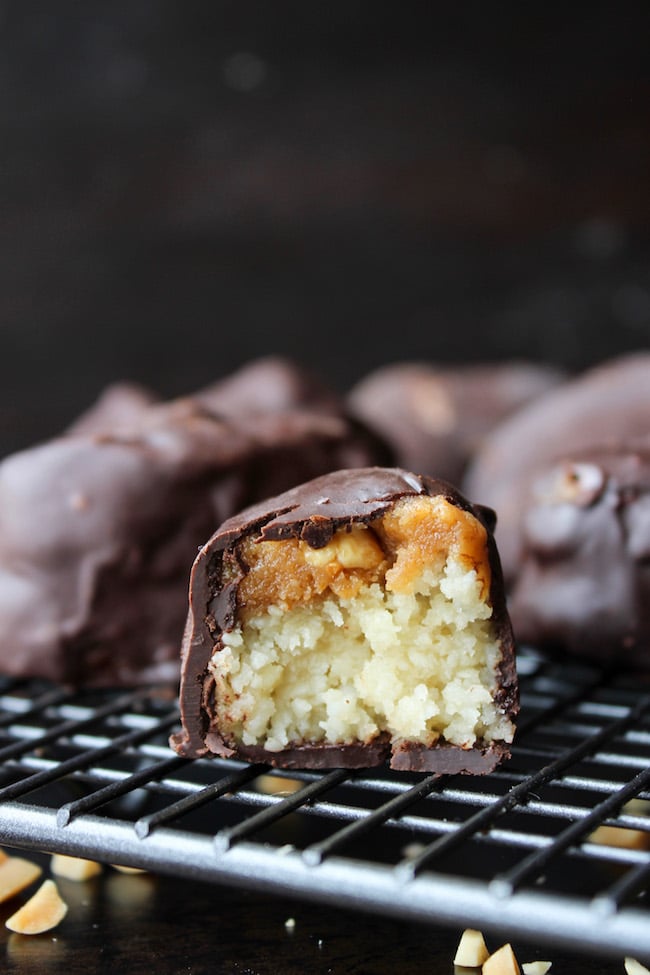 “No bake, healthier homemade snickers bars. Made with a coconut almond nougat, topped with a simple vegan caramel sauce and dipped in dark chocolate. Paleo + Vegan” Recipe: ASaucyKitchen.