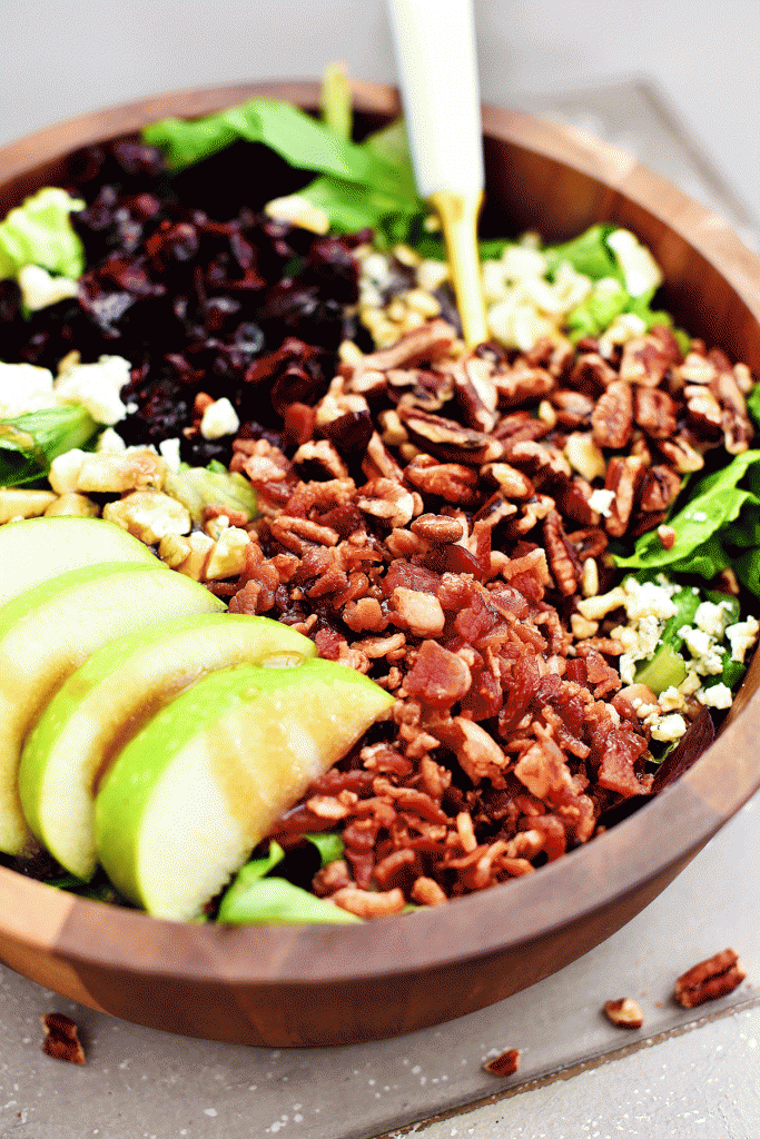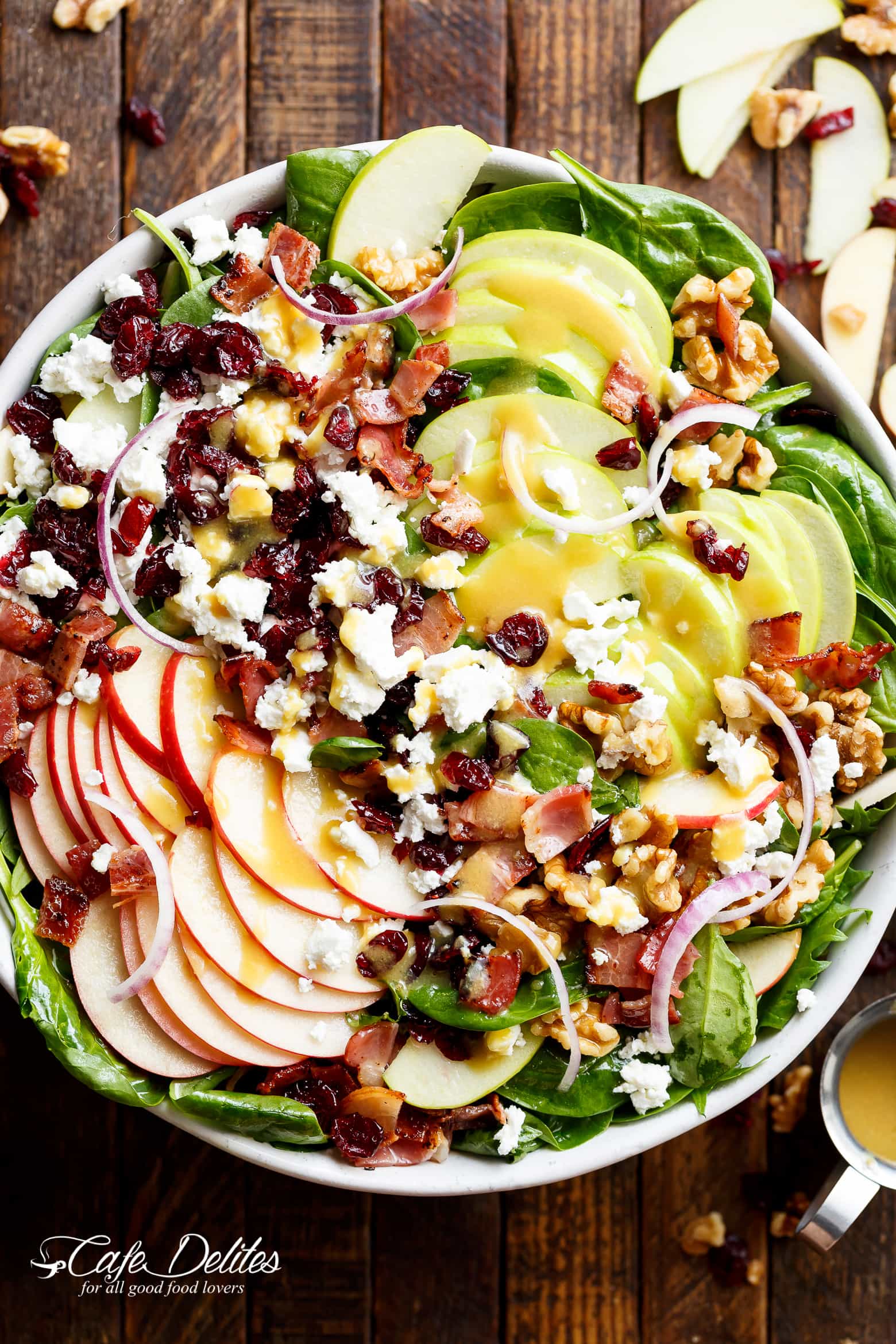 “Honey Dijon Apple Bacon Cranberry Salad screams FALL! Cranberries, Spinach, Walnuts And BACON! All drizzled with the most perfect Honey Dijon Dressing!” Recipe: CafeDelites.
