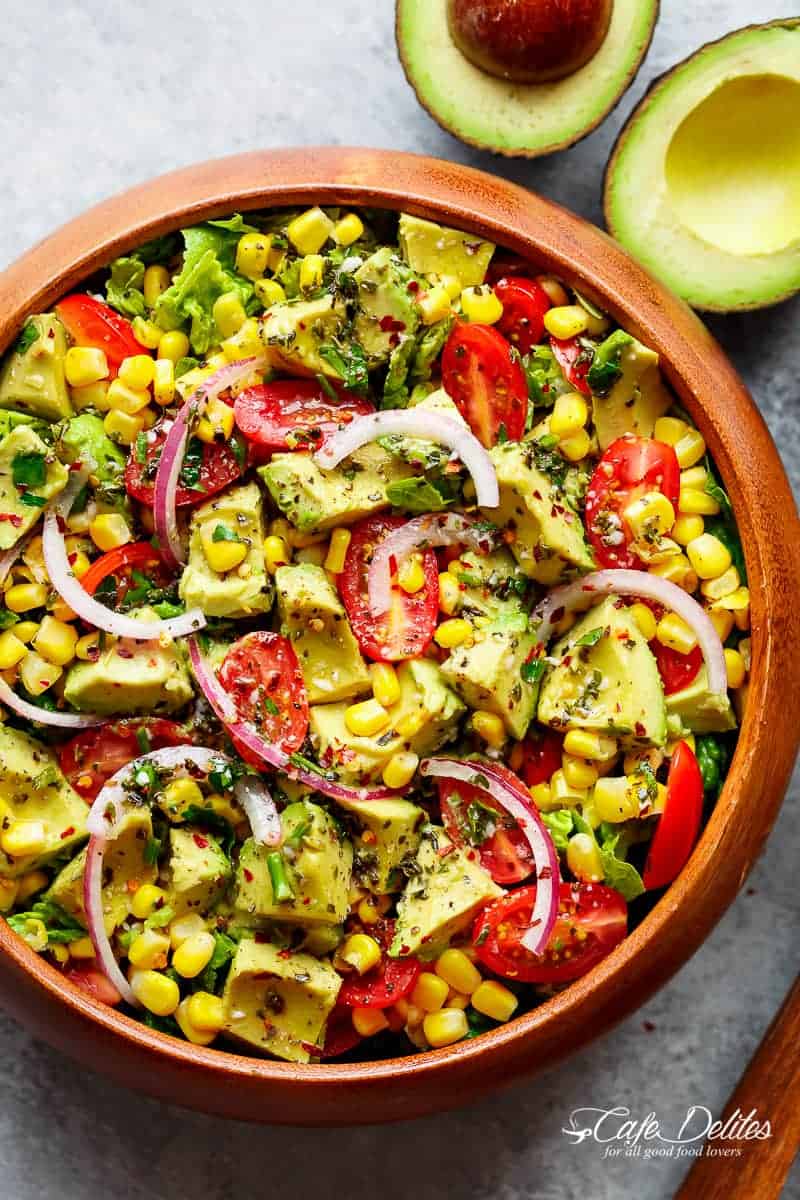“Avocado corn tomato salad with a lime juice dressing is delicious served on its own, or as a side that easily pairs with anything on your plate!” Recipe: CafeDelites.