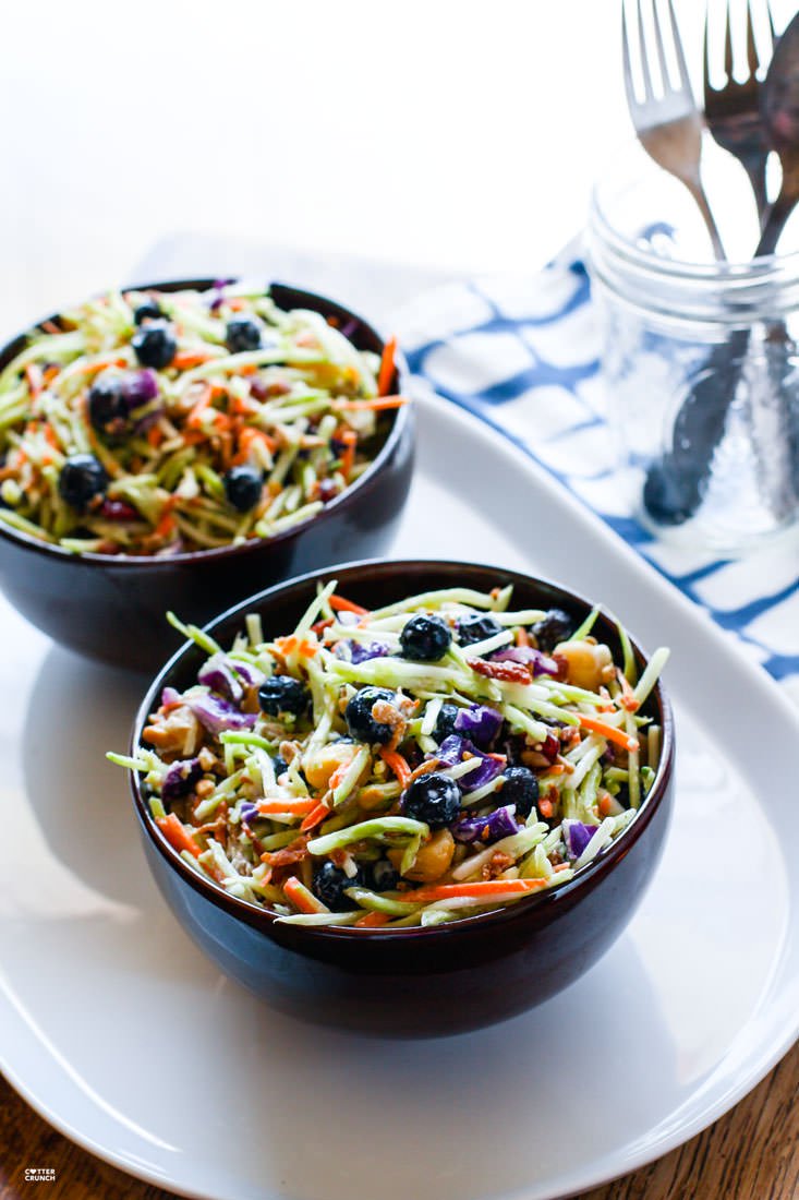 “Broccoli Slaw Salad with Blueberries is tart and creamy, and packed with antioxidants and probiotics! The tang comes from using a kefir yogurt blend; no mayo needed! Which also makes it healthy and gut friendly. Super clean eating recipe with great flavor! ” Recipe: CotterCrunch.