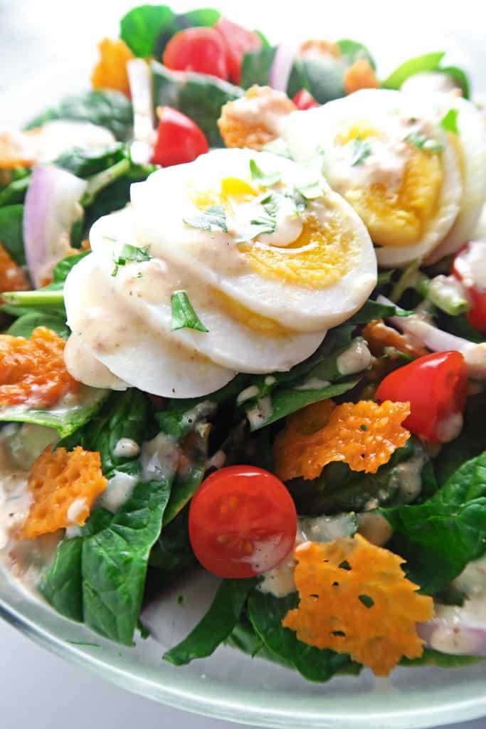 “This delicious spinach bacon salad recipe is brimming with crunchy cheddar cheese crisps, crisp spinach, juicy tomatoes, and smoky bacon dijon dressing.” Recipe: WholesomeYum.