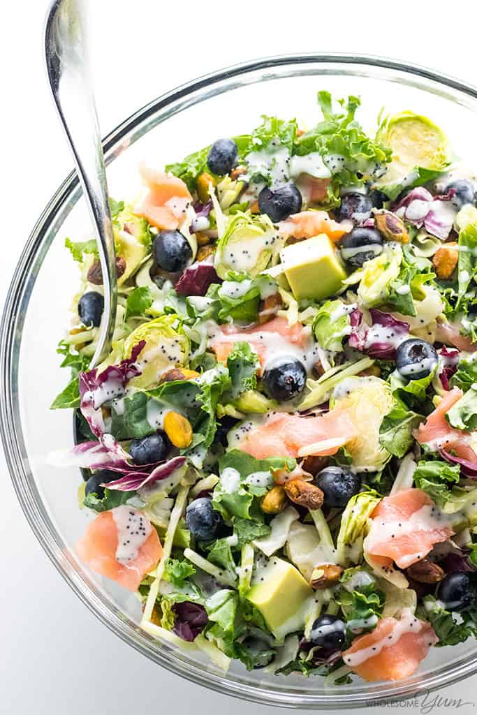 “Easy sweet kale superfood salad with lemon vinaigrette, smoked salmon and avocado is like a better Costco kale salad. 5 ingredients, plus 5 in the dressing!” Recipe: WholesomeYum.