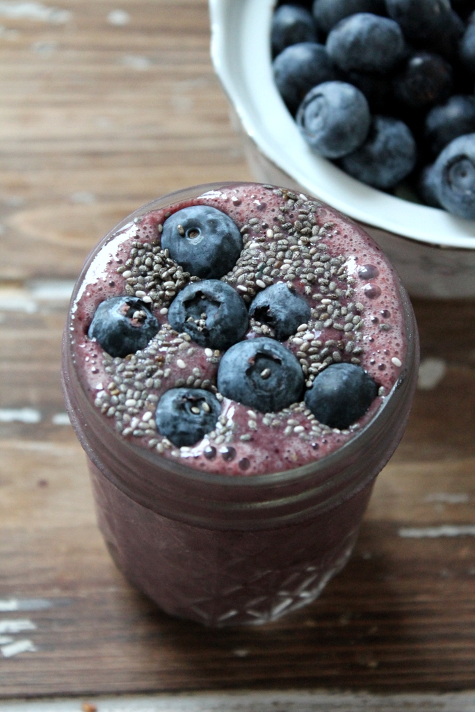 ” A delicious smoothie made with wild blueberries, banana, almond milk and spinach for a nutritional boost. Finished with a sprinkle of chia seeds for a healthy dose of omega-3.” Recipe: AmbitiousKitchen.