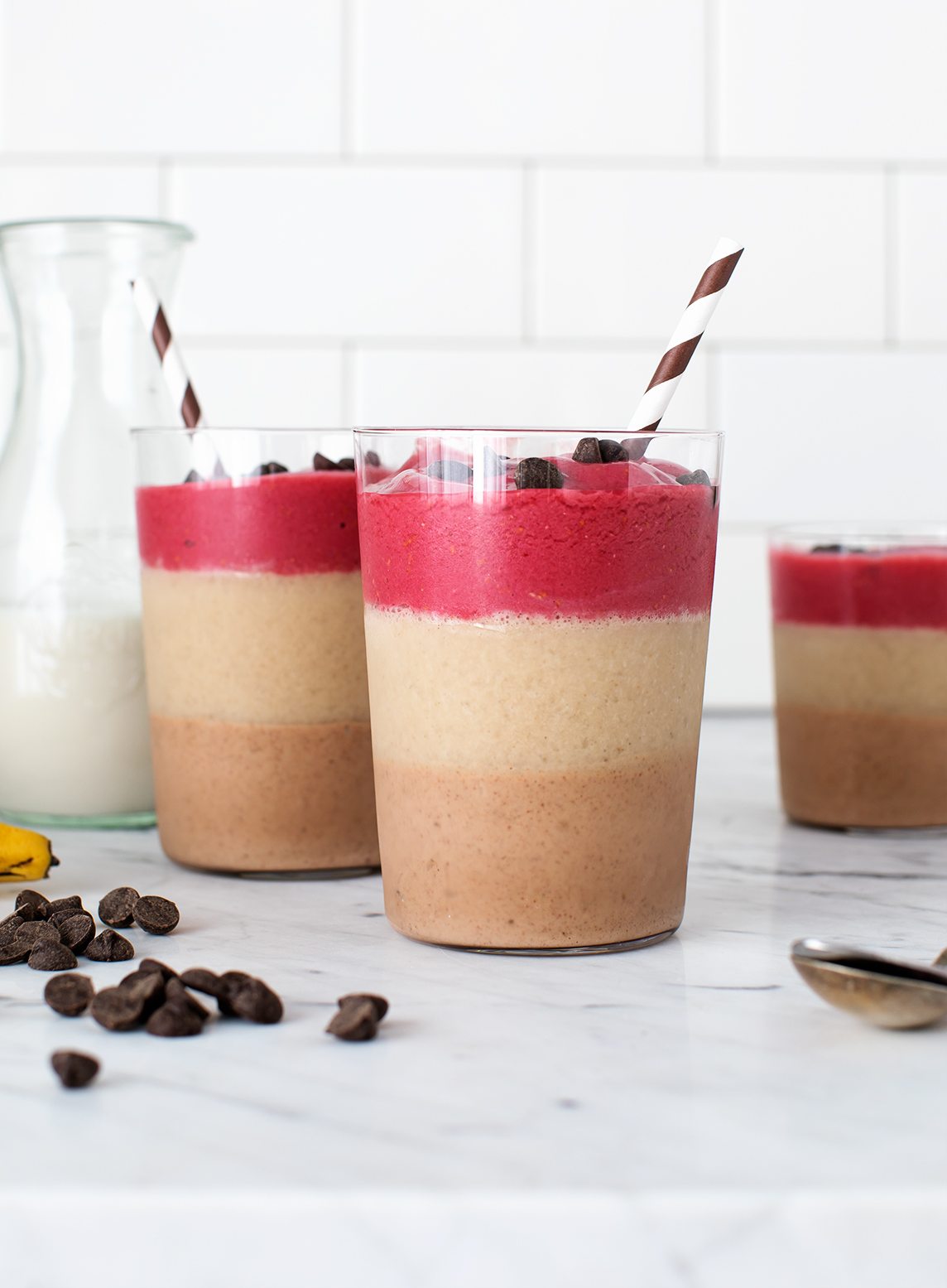“The bottom layer is made with almond butter, cocoa powder, and dates. The middle layer is made with banana, vanilla and (more) dates. The top layer is a mix of frozen strawberries and raspberries. Each one is blended with generous amounts of Almond Breeze almondmilk, which is a staple ingredient in my fridge.” Recipe: LoveAndLemons.