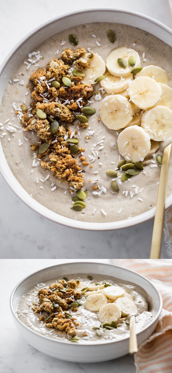 “I just can’t get enough of this creamy, monochrome smoothie bowl! Packed with protein and healthy fats, it keeps me going all morning long, and its subtle, earthy flavours and thick texture are the perfect base for loading on all kinds of toppings.” Recipe: OhSheGlows.