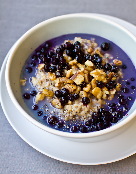 “Purple-Blue Vegan Oats. This bowl starts with some basic, rustic steel cut oats. The tender oats plump when infused with a hearty sprinkle of chia seeds. Crunchy walnuts and a few dashes of cinnamon add warmth. Sweet-tart goji berries that swell and become delightfully squishy in the warm oatmeal add some pink perkiness.” Recipe: LunchBoxBrunch.