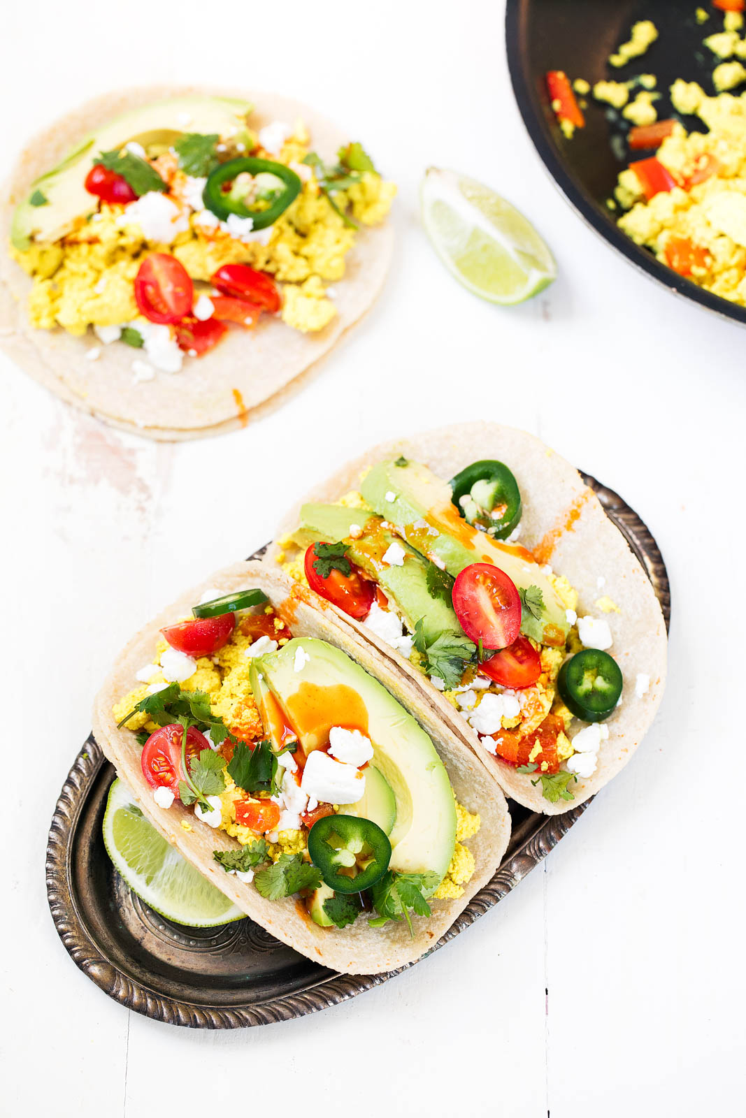 “Scrambled tofu with delicious spices gets piled high into corn tortillas and topped with avocado, cilantro and so much more! Easy to make ahead and reheat for an on the go breakfast.” Recipe: AmbitiousKitchen.