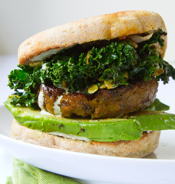 “Creamy chipotle jalapeno sauce drizzles and melts over top tender avocado, a pepper-chipotle spiced vegan sausage patty, buttery pan-toasted pepitas, shallot-infused kale and plenty of fine pepper. All on a toasted English muffin. ” Recipe: LunchBoxBrunch.
