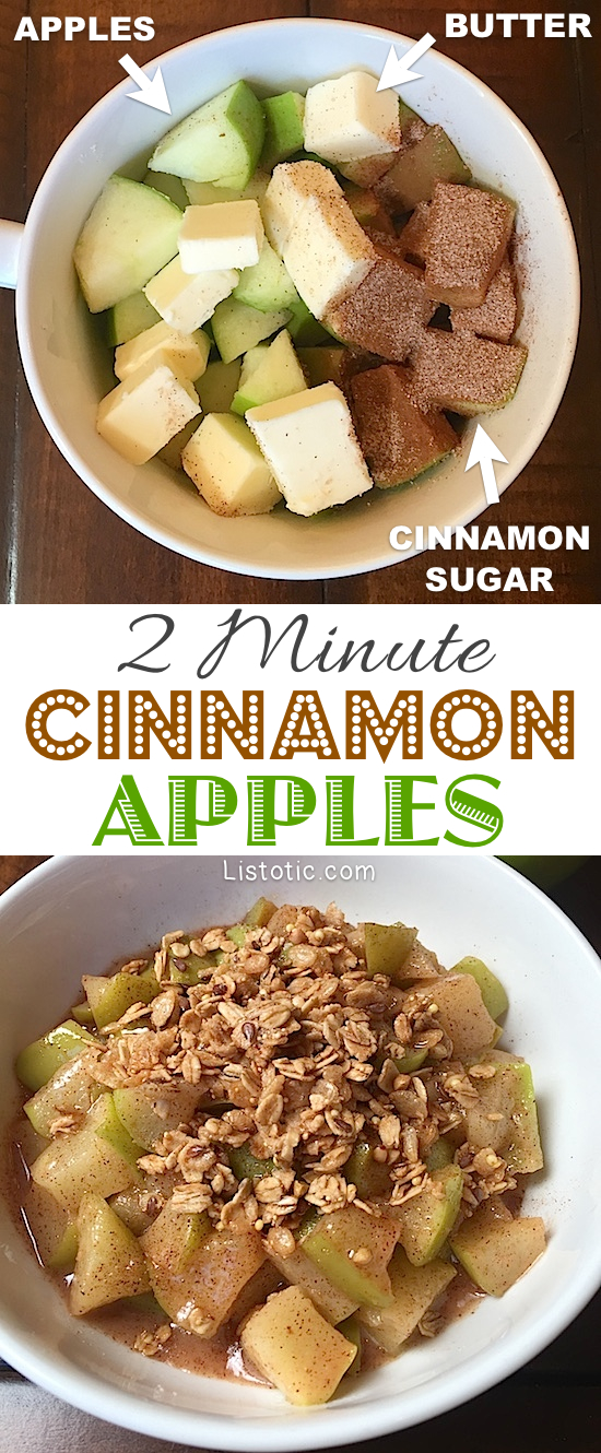 “This treat is not only as easy as pie, but it tastes just like pie, too! I’m not really sure why that is a figure of speech because pie really isn’t that easy… UNLESS, you pop a few ingredients into the microwave, top it with granola or vanilla ice cream, and savor all of the hard work you didn’t have to do.” Recipe from Listotic.com