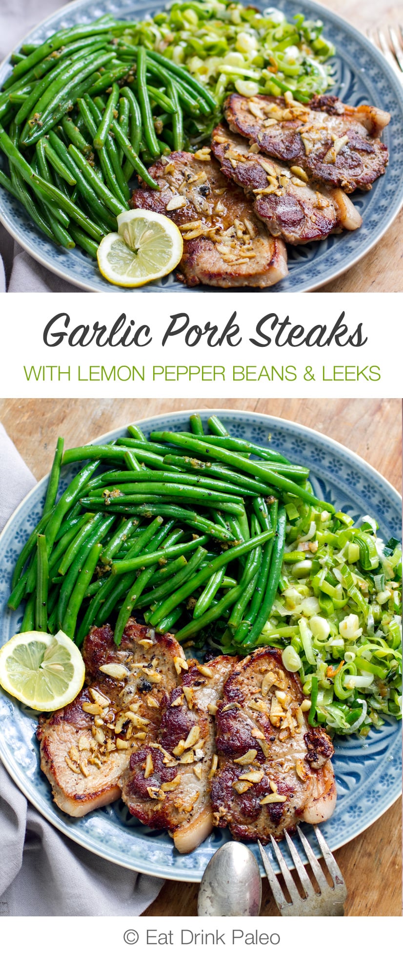 “Crispy and juicy, these garlic pork steaks will show you just how easy and delicious cooking with pork can be. Served with crunchy lemon pepper green beans and golden fried leeks, they are fabulously delicious and nourishing.”. Recipe: EatDrinkPaleo.