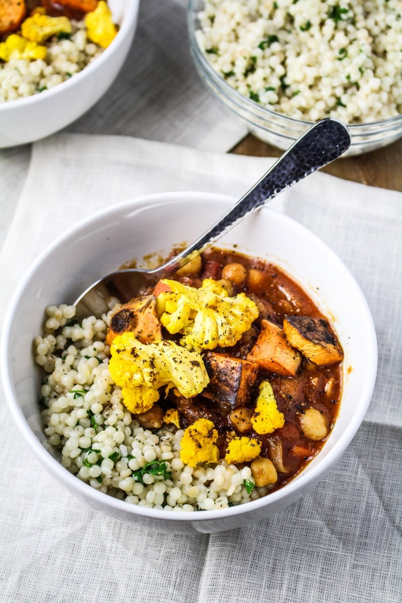 “Really it’s somewhere between a stew and a vegetarian tagine, with sweet dried apricots plumped up from the rich broth, hearty chunks of sweet potato and cauliflower, and a thick, sweet-and-sour, almost sauce-like broth. Pomegranate molasses, preserved lemon, cinnamon, coriander, harissa, cumin, and nutmeg are the flavor base, making for a sweet and warming dish.” Recipe from WallFlowerKitchen.