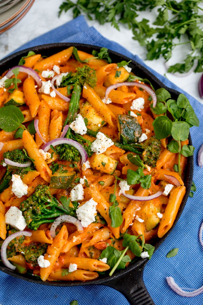 “One-Pot Cheese and Tomato Pasta with Spring Vegetables and creamy feta – a fab Meat-free Monday meal!” Recipe from KitchenSanctuary.