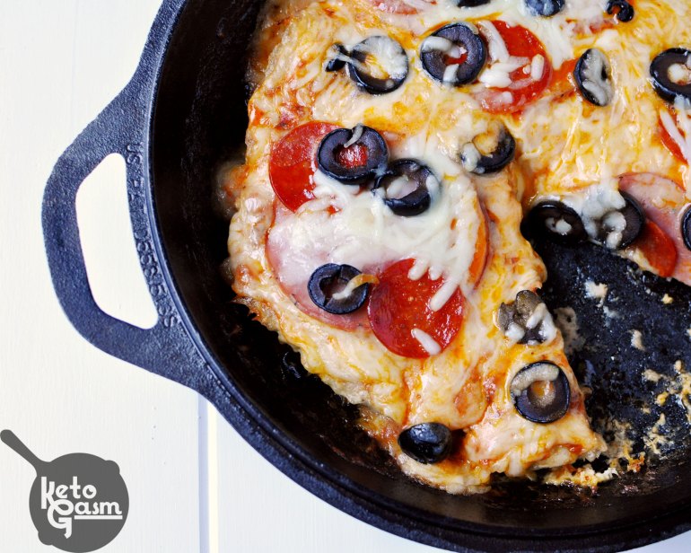 “Since then, I’ve tweaked a few things, played around with the ratios, cooking vessels, and a variety of toppings. I prefer to use a cast-iron skillet to get a nice crunch on the crust. Cast-iron skillets get super hot and stay that way, which is great for searing meat. Since your crust is made of meat and cheese, the meat is seared nicely while the cheese crisps up.” Recipe: Ketogasm.