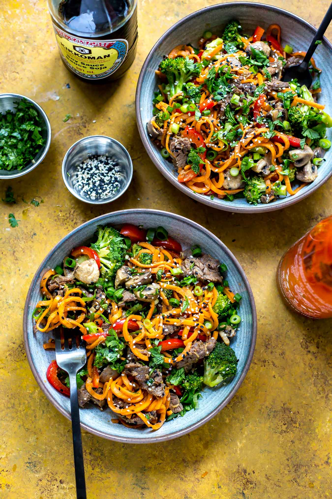 “These 30-Minute Ginger Beef Sweet Potato Noodles are a quick and easy dinner option! Spiralized sweet potato noodles and a marinade that doubles as a stir fry sauce makes this meal super fast for busy weeknights.”. Recipe: TheGirlOnBloor.