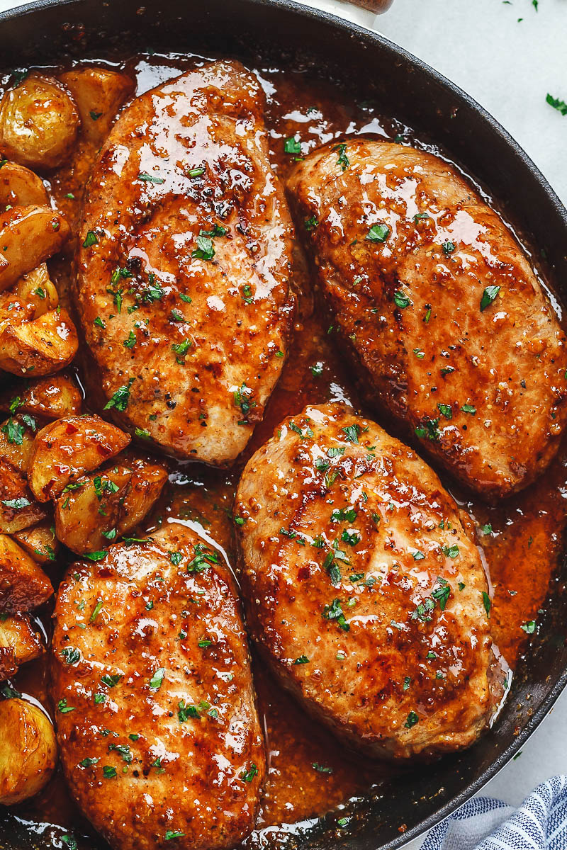 “Honey Mustard Pork Chops and Potatoes Skillet – Best ever melt in your mouth, super delicious pork chops! Juicy tender pork chops are seared and coated in a lip-smacking honey mustard glaze and served along with crisp baby potatoes. Perfect for a family weeknight dinner, or a party!”. Recipe: EatWell101.