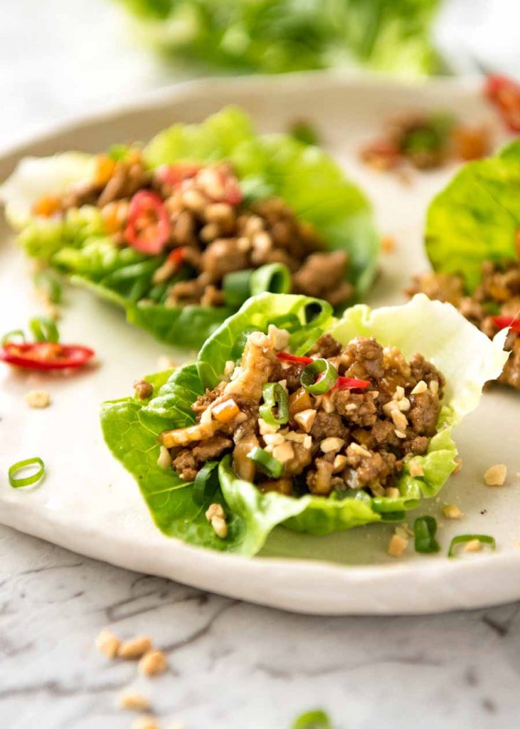 “One of my favourite Chinese starters – Lettuce Wraps with pork or chicken, loads of hidden crunchy vegetables in a tasty savoury brown sauce, bundled up in fresh lettuce. Also known as San Choy Bow, it’s arguably the ultimate “just happens to be healthy” food in the whole wide world …..”. Recipe: RecipeTinEats.