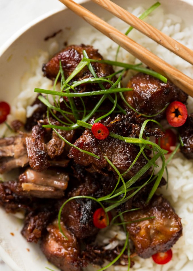 “Tender pork in a sticky savoury sweet glaze made with just a handful of supermarket ingredients, this Vietnamese Caramel Pork is a fantastic way to transform a budget cut of pork into something exotic and spectacular. This is a magical easy recipe!!”. Recipe: RecipeTinEats.