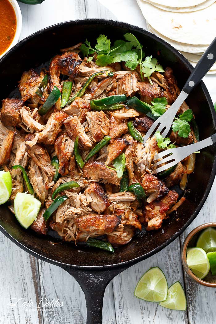 “Crispy Slow Cooker Carnitas (Mexican Pulled Pork) Con Ancho Chiles | Poblano Peppers smothered in so much flavour, you won’t be able to put your forks down!” Recipe: cafedelites.com