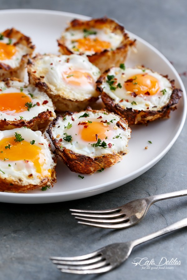“Cauliflower Hash Brown Egg Cups are low carb and gluten free! Point friendly hash browns made into cups with a perfectly runny egg. That’s it. That’s all that needs to be said.” Recipe: cafedelites.com