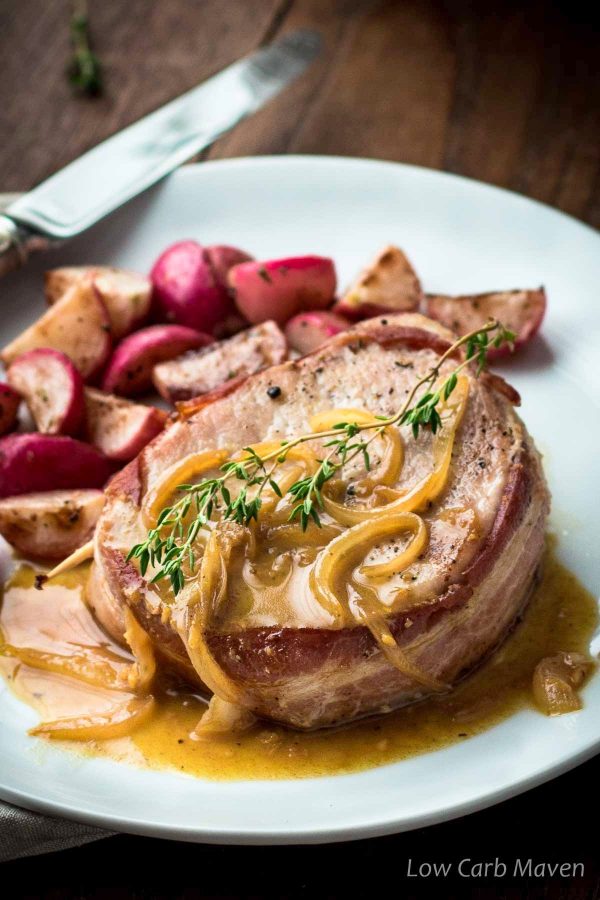 “Pan seared bacon wrapped pork chops with a delicious apple cider vinegar glaze (the perfect pan sauce) flavored with onions and fresh thyme. Another great entree ready in under 30 minutes.” Recipe: LowCarbMaven.