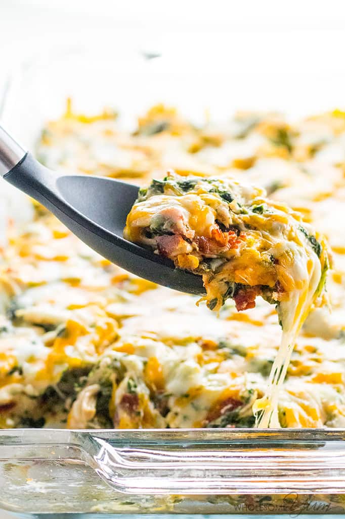 “A low carb, cheesy chicken bacon ranch casserole recipe that the whole family will love. Quick and easy with just 7 common ingredients and 5 minutes prep!” Recipe: WholesomeYum.