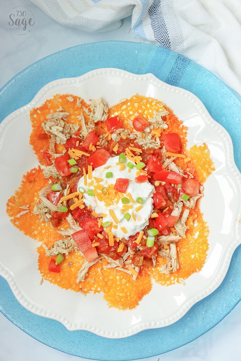 “Make delicious keto nachos with chicken in the slow cooker. These low carb nachos are delicious and use cheddar cheese crisps instead of traditional tortilla chips. Add your favorite toppings like sour cream, tomatoes and onions and you won’t even miss the corn chips.” Recipe: 730SageStreet.