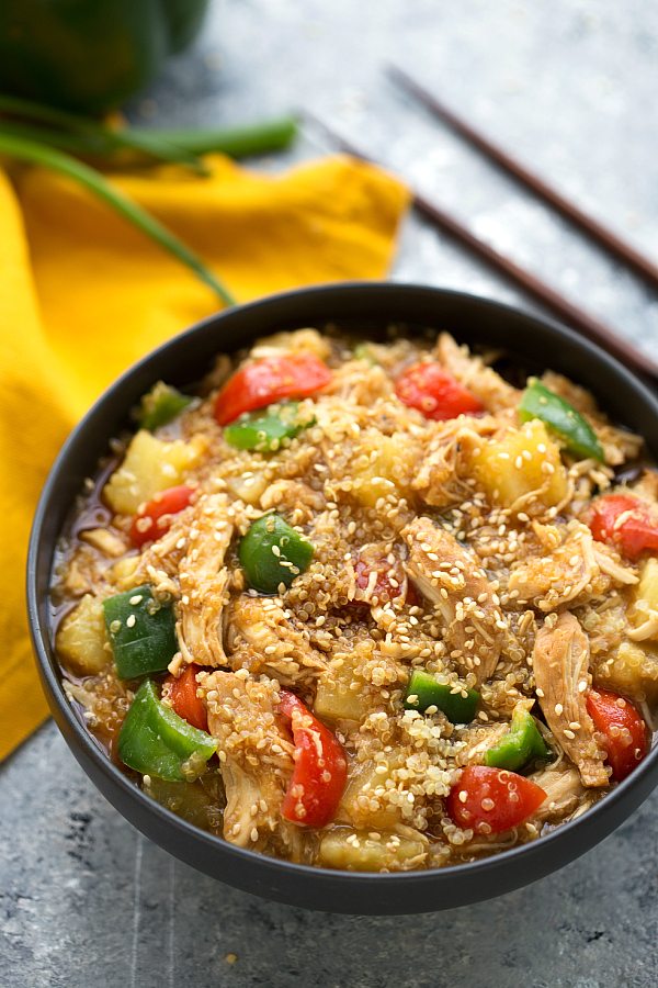 “This SUPER simple slow cooker sweet chili chicken has just 6 ingredients! And this chicken makes a perfect base for so many recipes, including quesadillas, rice bowls and tacos.”. Recipe: SweetPeasAndSaffron.