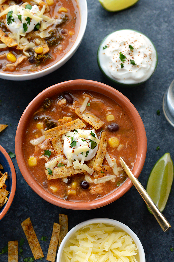 “A delicious slow cooker Mexican tortilla chicken and quinoa soup with delicious add-ins such as fresh lime, avocado, tortilla chips, and sour cream. “. Recipe: ChelseasMessyApron.