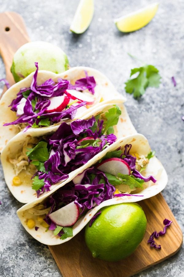 “These slow cooker cilantro lime chicken tacos can be assembled ahead and stored in the freezer until you are ready to cook them up. The cilantro lime chicken is versatile and is also great on salad, in wraps, pizza, you name it!”. Recipe: SweetPeasAndSaffron.