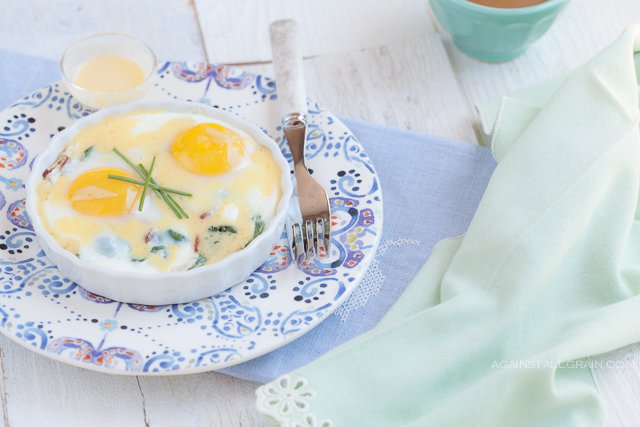 Baked Eggs with Paleo Hollandise Sauce From Againstallgrain.com