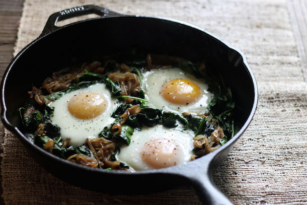 This breakfast skillet is loaded with dark, leafy greens and sweet, caramelised onions. What more could you want?