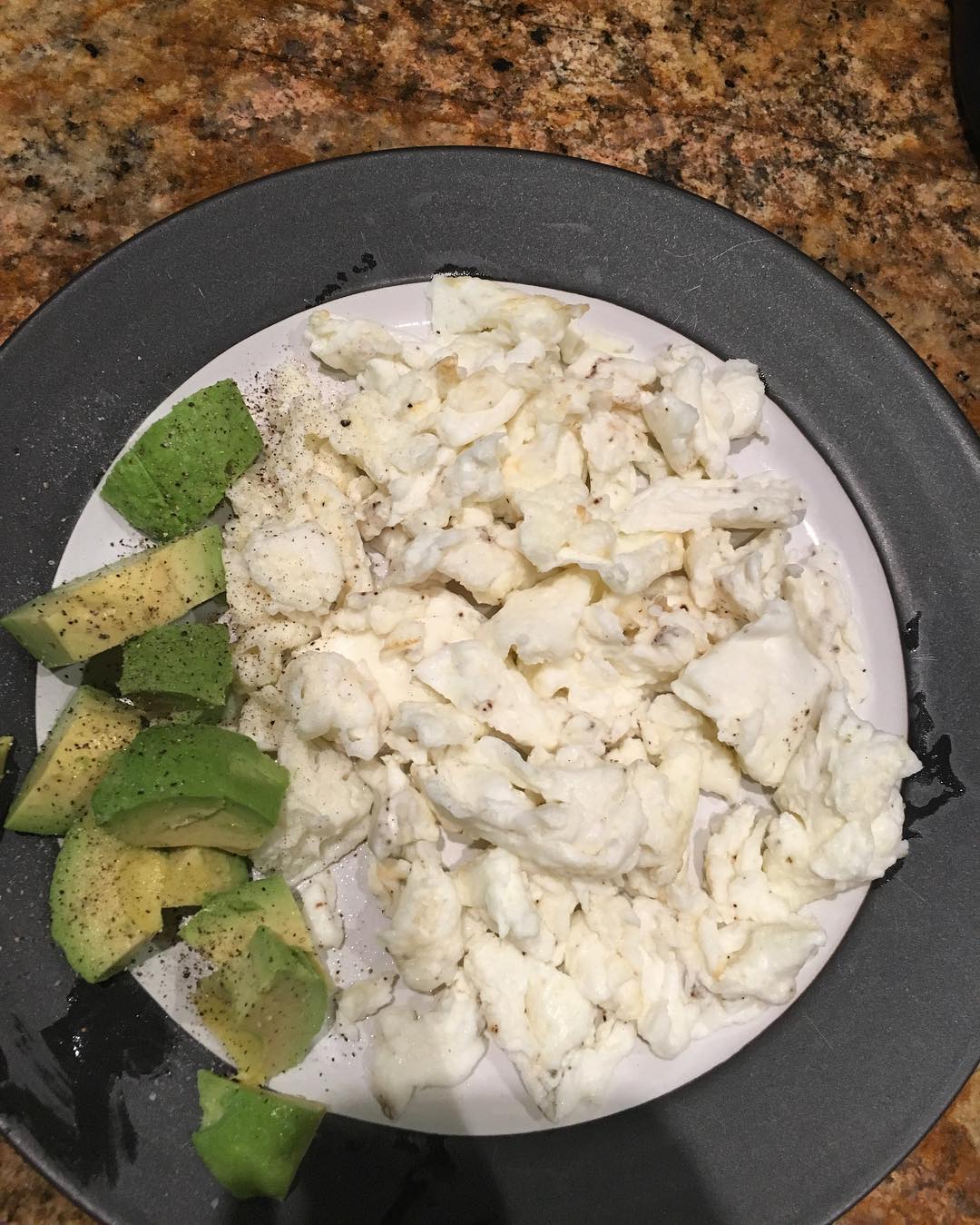 “May not be elaborate or beautiful but it’s a simple and easy KETO breakfast 🏆 1 c egg whites, 1/2 avocado. Macros: about 27g P, 14g F, 10 C.”