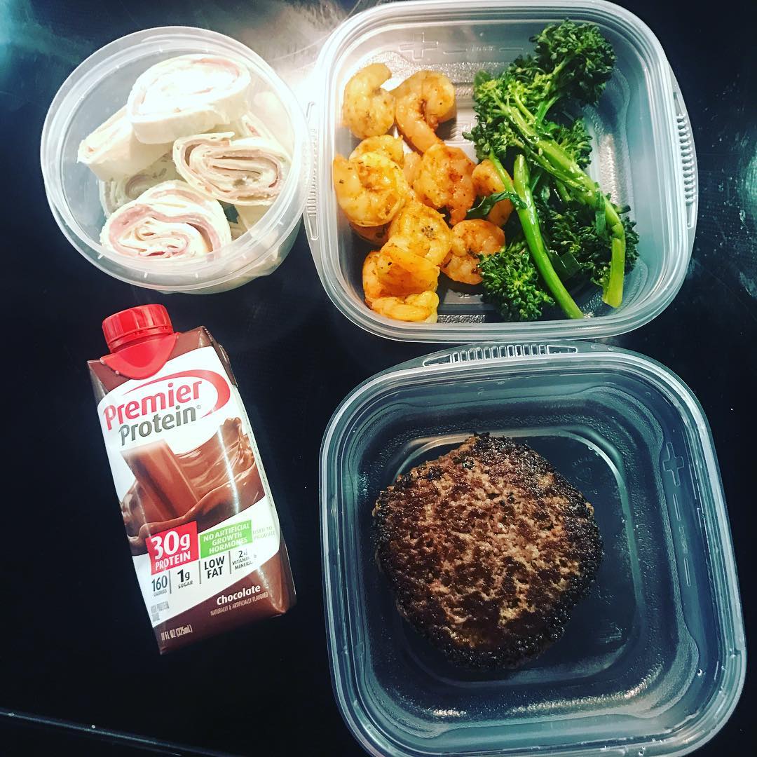 “Meal prep for tomorrow is done! Only took me about 30 minutes to get all of this cooked up. What I have: protein shake (will be blended with MBreakfast), low carb Tortilla wrap, peppercorn burger, and Cajun shrimp with broccolini! Smells delicious”