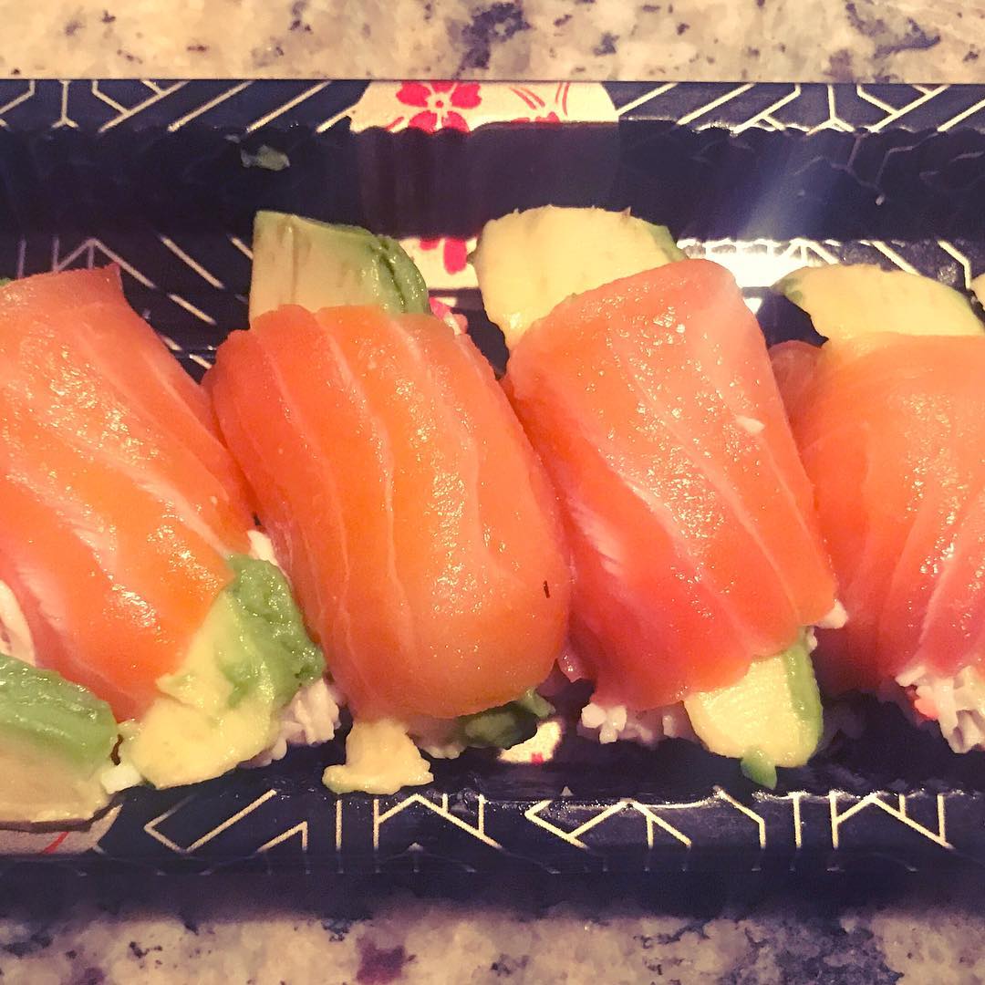 “Friends!! Low carb sushi find!! So this is crab meat, avocado, wrapped in salmon. I put some soy sauce and wasabi on it.”