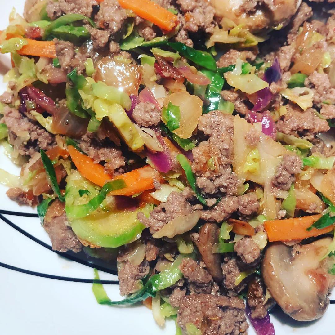“OBSESSED with this low-carb recipe: crack slaw. Ingredients: Ground beef, bag of cole slaw mix, bag of shaved Brussel sprouts, 1/2 c chopped onion, 1/2 c mushrooms, 3 T sesame seed oil, sriracha, and soy sauce. It’s simple! Brown the beef, sauté the veggies in the oil, mix together and top with chili paste and sriracha to your liking!.”