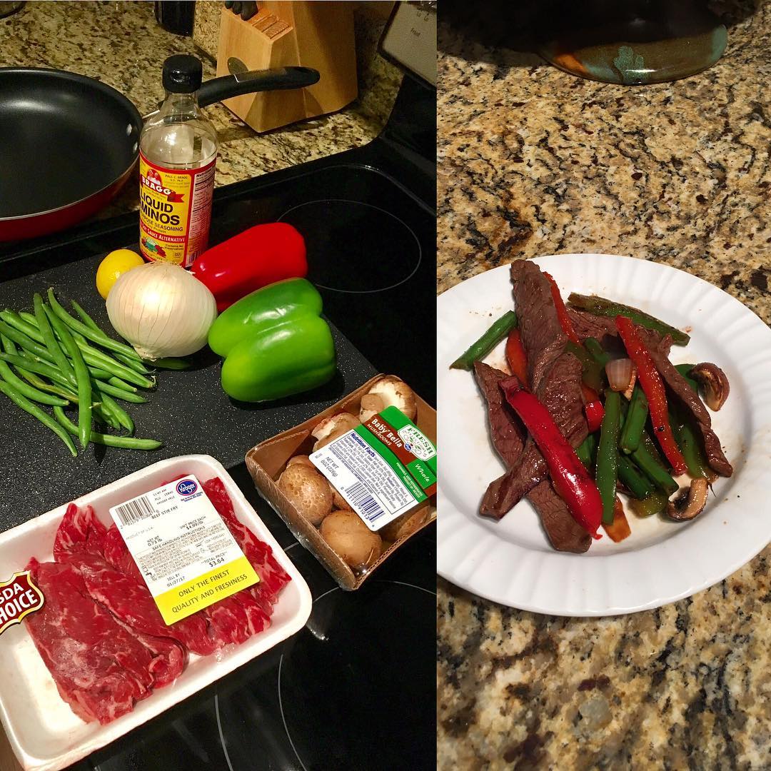“Easy low carb stir fry! 😋 Ingredients : Bell pepper, White onion, Mushroom, Green Beans, Sirloin strips, Liquid Aminos, Garlic, Salt, Pepper. 1. Chop veggies 2. Sauté all veggies except mushrooms with seasonings and liquid amino. 3. Add meat and mushrooms (and more liquid aminos if needed) For those on a carb adaptive diet, this stir fry goes great with steamed rice!”