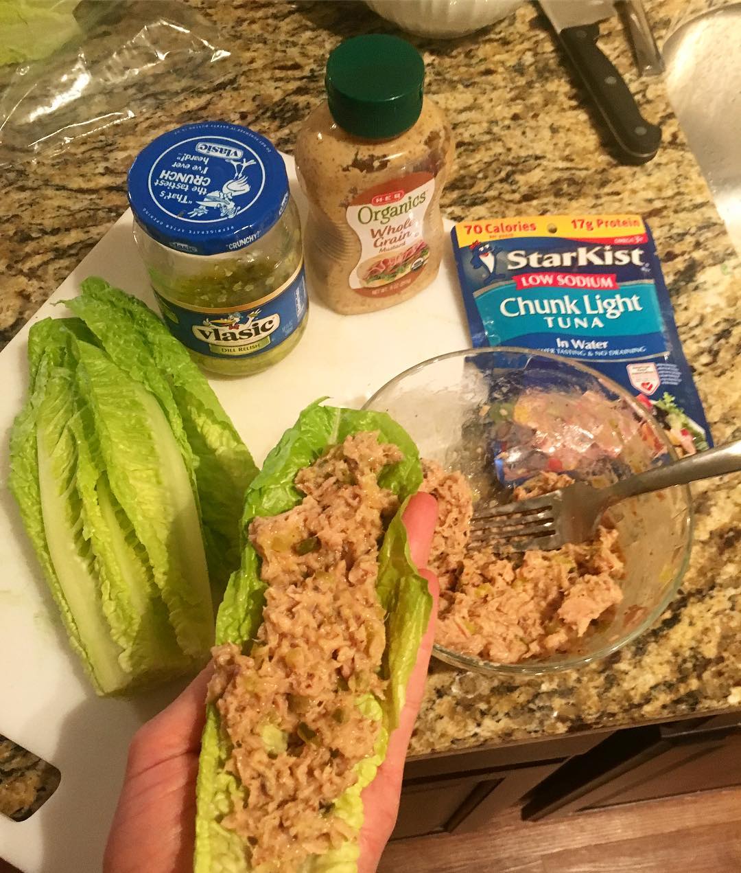 “Simple, easy and delicious! Tuna salad (tuna, relish and whole grain mustard) in romaine lettuce”